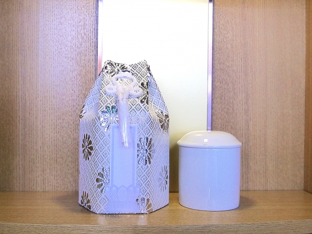 手元供養とは、小さな骨壺に遺骨を入れて仏壇と一緒に置いておく供養方法。スペースも机上に収まるくらいなので、幅を取らないのが利点です。